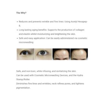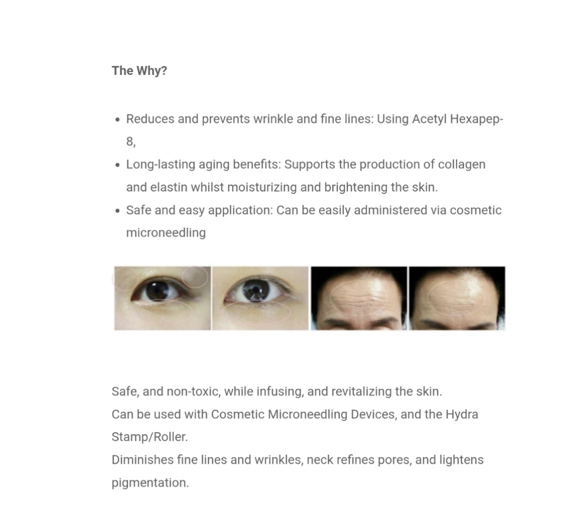 When applied using the Hydra Stamp or microneedling device, this skin booster works to restore the skin’s barrier function, reduces fine lines and wrinkles, improves the complexion, and reduces the size and appearance of pores.