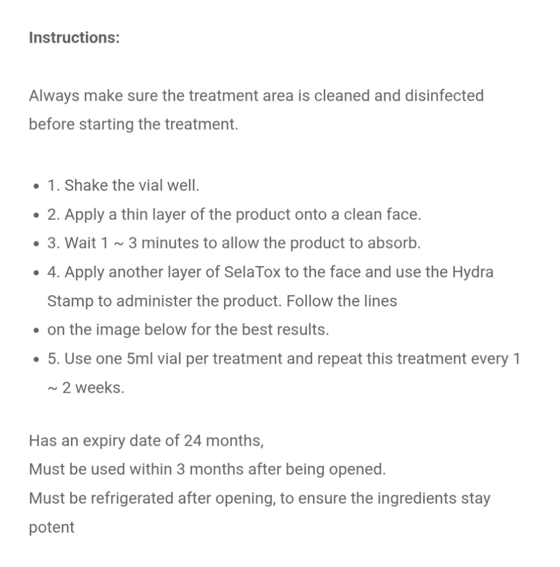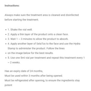 SelaTox is a skin booster that contains Acetyl Hexapeptide-8, which is well-known to have similar effects to tox, and works to lift, tighten and moisturize your skin, alleviating the appearance of fine lines and wrinkles.